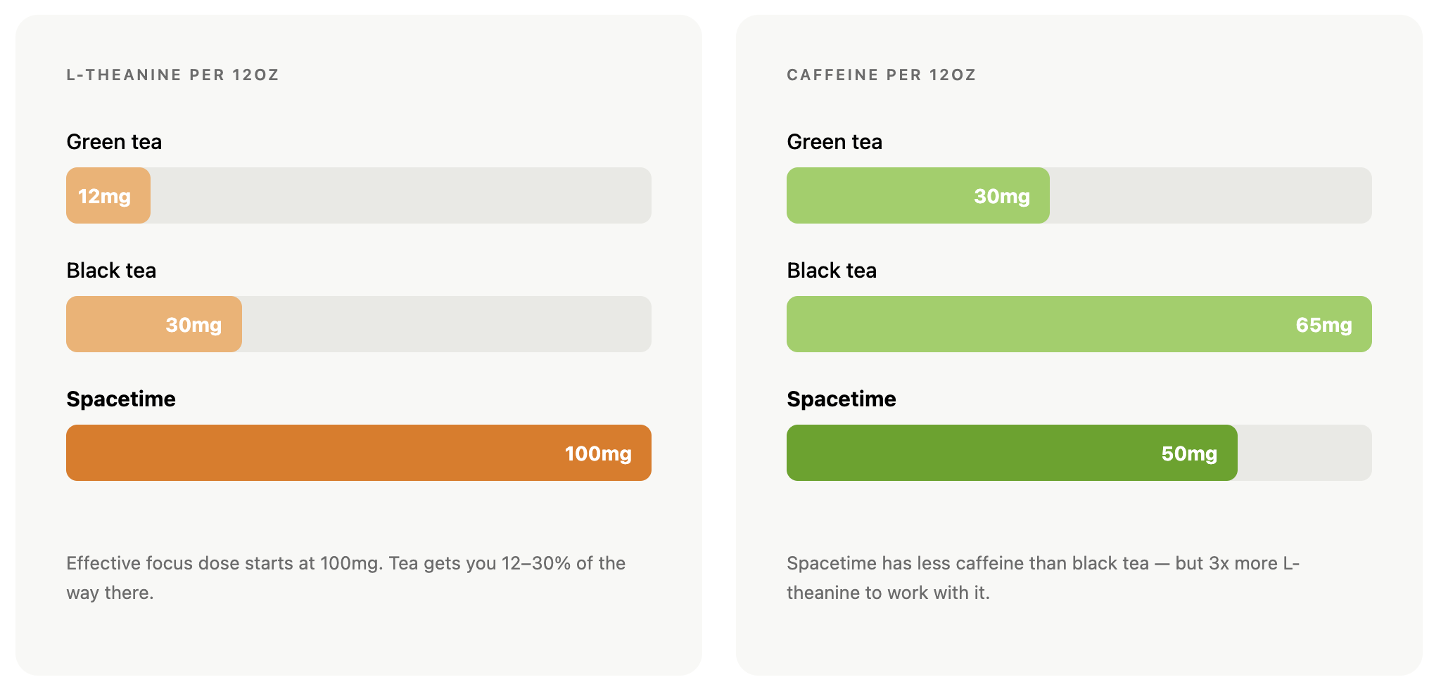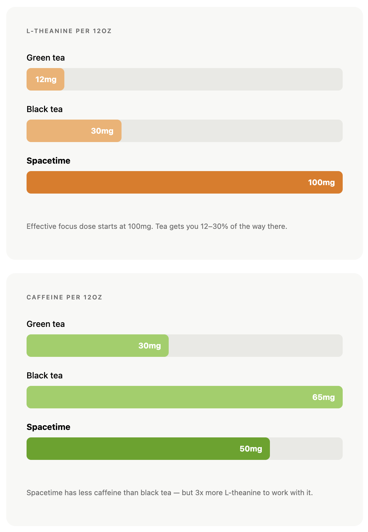 To match one Spacetime's L-theanine from tea, you'd need 8 cups of green tea or 3 cups of black tea — and you'd be taking in 2–5x more caffeine in the process.