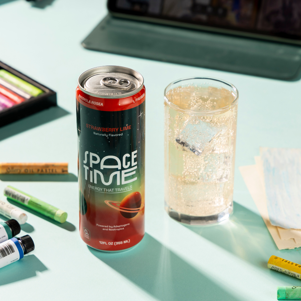 SpaceTime is a lightly fizzy, naturally flavored drink with 50mg of caffeine, designed to give you a clean, smooth boost—without the sugar, artificial flavors, or crash of traditional energy drinks.